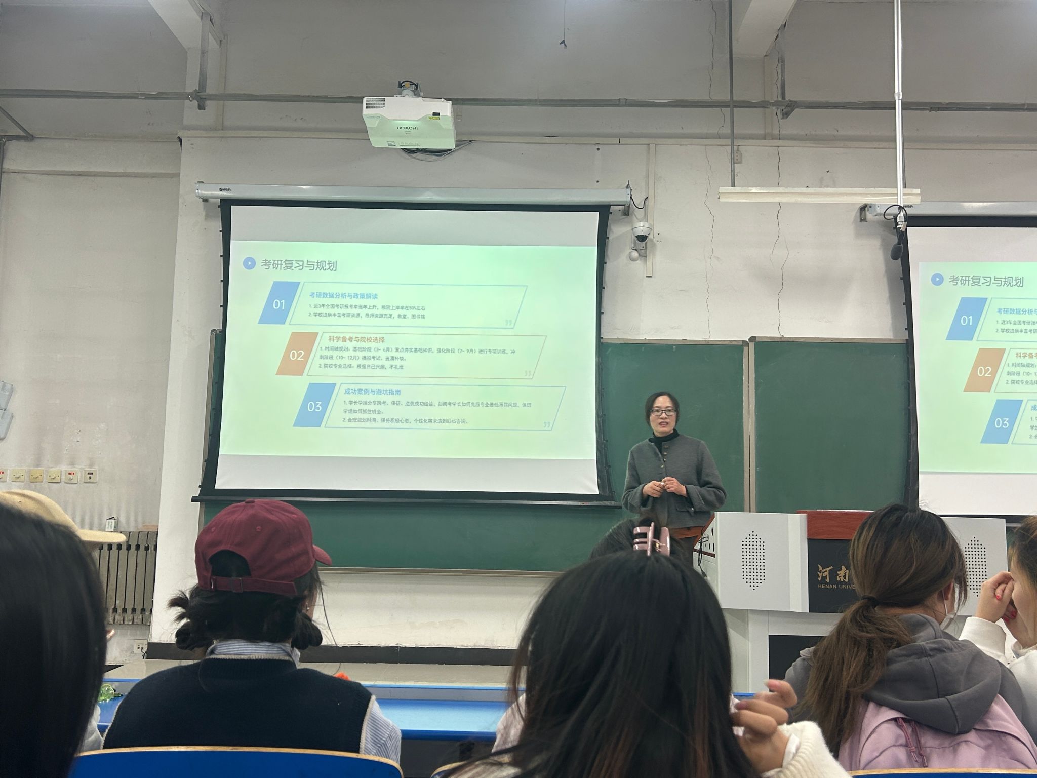 王桂英聚焦考研择校策略、复习计划制定、心理状态调整等方面,通过系统化指导与多维度资源支持,助力学子坚定信念、科学备战。她指出,随着国家“粮食安全”战略地位的提升,本专业高层次人才需求持续增长,考研既是个人职业发展的关键环节,更是服务国家战略的重要选择。她通过展示近三年学院考研录取率、重点院校分布等数据,根据学科实力、地域资源、个人兴趣等方面,指导学生建立个性化择校方案。针对学生普遍关注的备考难点,和部分同学存在的焦虑情绪,她分别给出了具体的解决方案。